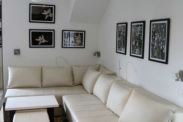 Dnevni boravak cine ugaona garnitura za sedenje sa niskim stocicem, trpezarijski deo i “otvorena kuhinja”. Ceo prostor je tematski uniforman, tako da se ova tri dela, funcionalno specificna a u isto vreme funkcionalno isprepletana, vizuelno utapaju jedan u drugi, sto je narocito bitno za kuhinju koja je na dohvatu ruke ali vrlo nenametljivo utanja u nisu.