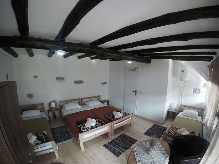 tradicionalno opremljenih soba od toga 1 jednokrevetnu, 1 dvokrevetnu, 1 trokrevetnu i 1 cetvorokrevetnu.Drugi objekat sadrzi 5 moderno opremljenih soba od toga 3